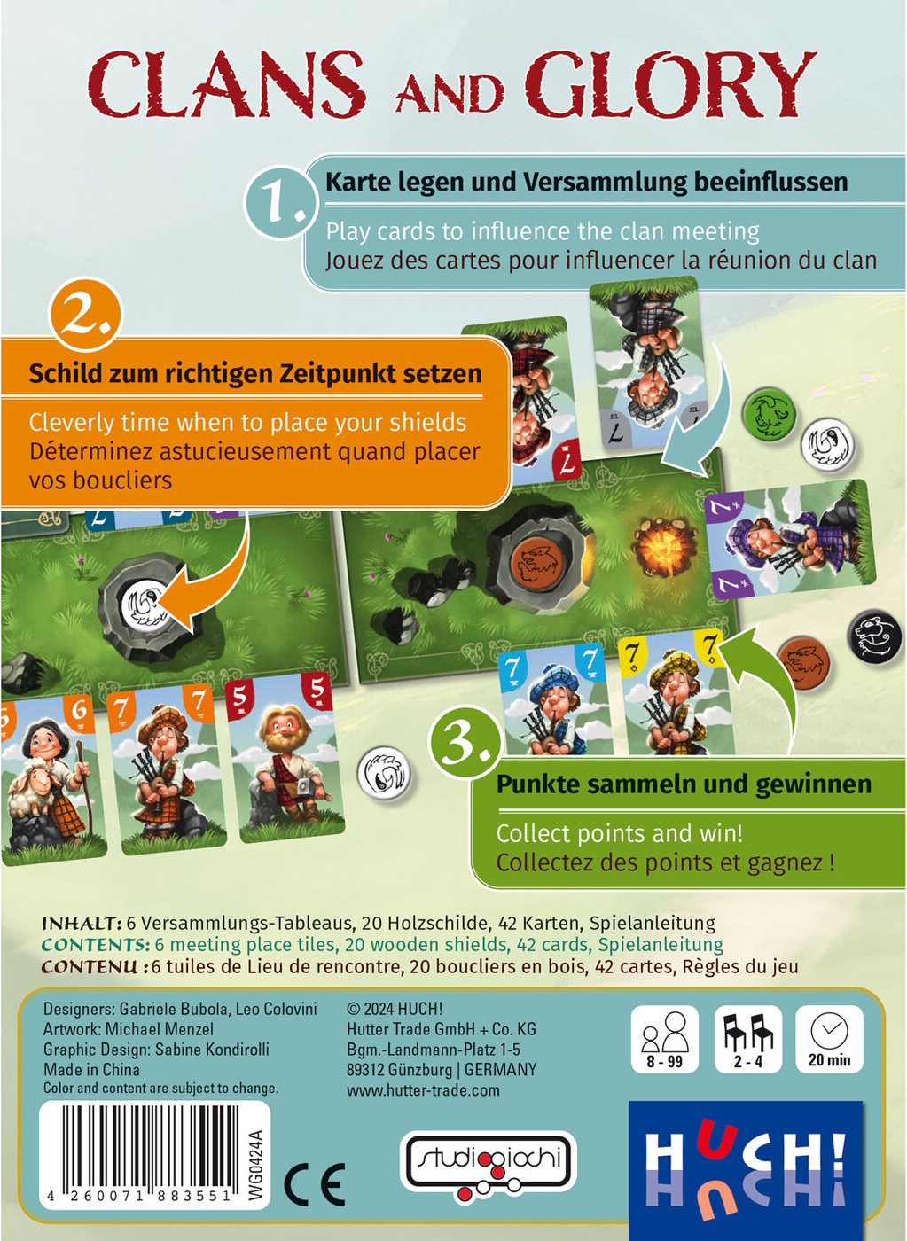 In Clans and Glory nimmst du an einem uralten Ritual teil: Von nah und fern sind die freien Völker der schottischen Highlands zum Versammlungsplatz gekommen, um sich einem Clan-Chief anzuschliessen. Schaffst du es, die besten Gefolgsleute für dich zu gewinnen? Stelle dir den stärksten schottischen Clan zusammen – durch cleveres Kartenlegen und geschicktes Planen!