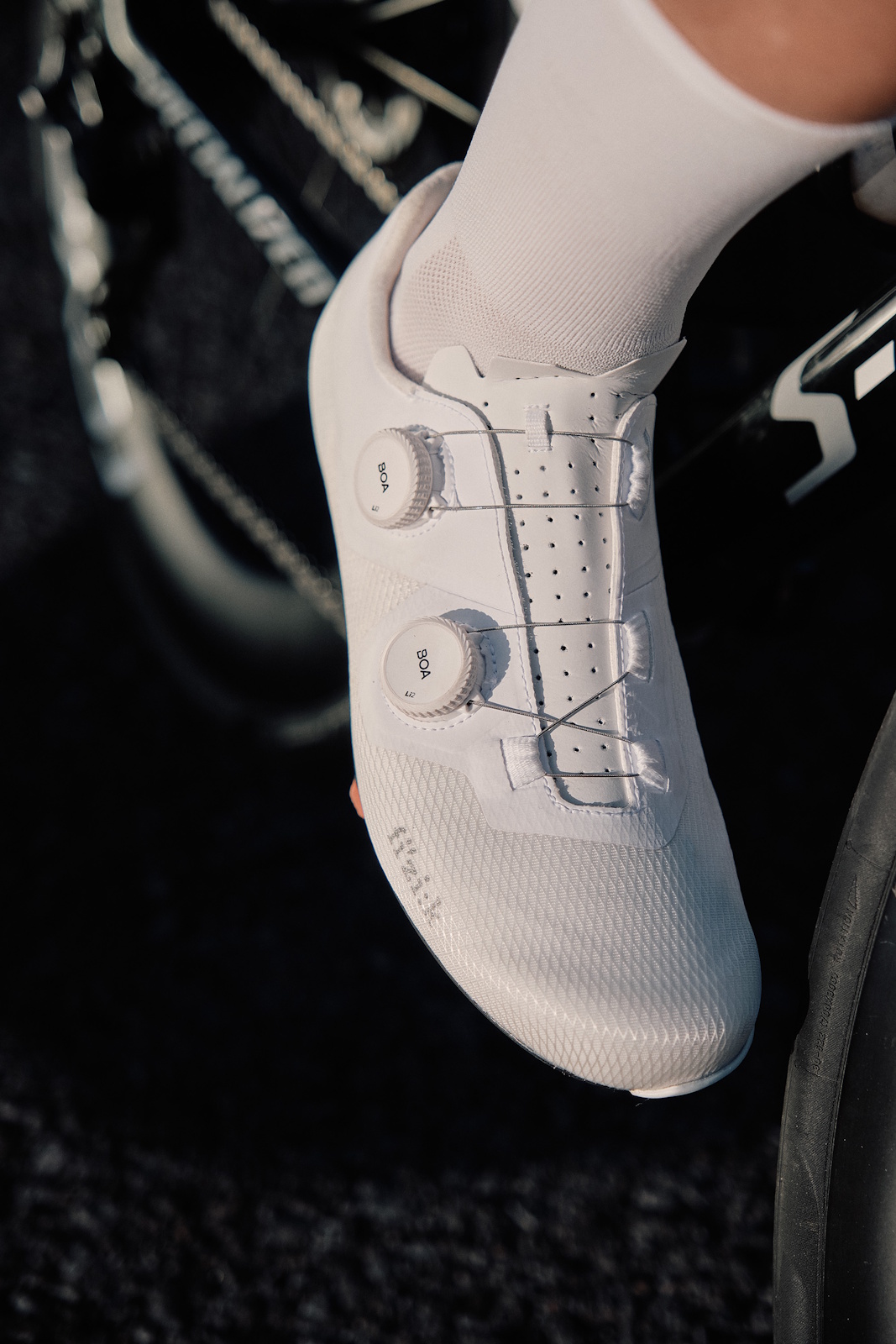 Der Lyra ist mit dem Dual-Dial Li2 BOA® Fit System ausgestattet, das eine unabhängige Anpassung von Spann und Mittelfuss ermöglicht. Das weiche, atmungsaktive Mesh-Obermaterial verbessert die Luftzirkulation über den gesamten Fuss. Strategisch platzierte PU-laminierte Verstärkungen rund um das Verschlusssystem und an der medialen Seite sorgen für zusätzliche Struktur und Stabilität. So entsteht ein sicheres und stabiles Gefühl für ganztägigen Komfort und Performance auch auf langen Rennradfahrten.